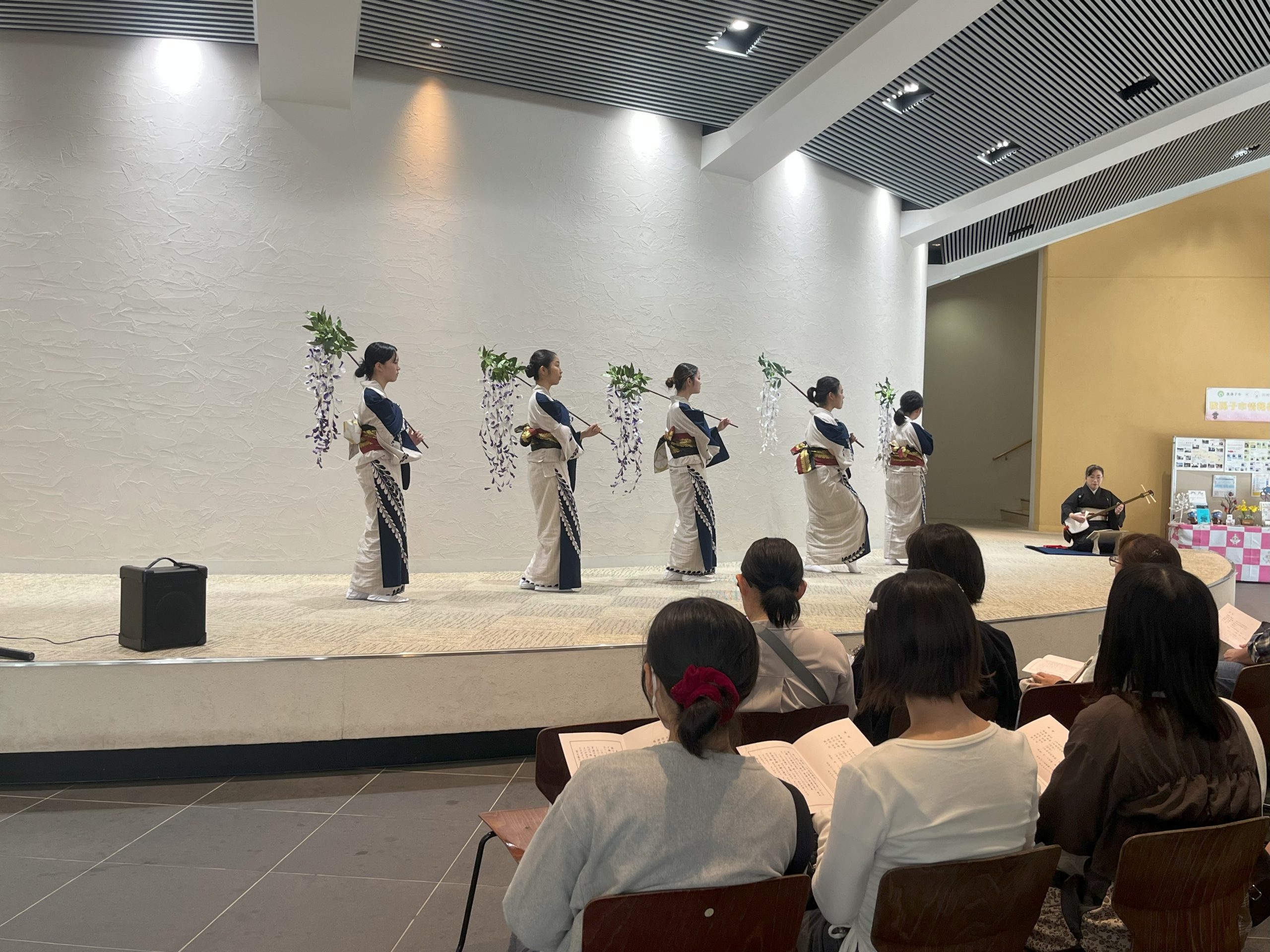 会場には、保護者の方をはじめ多くの方にお越しいただきました。学生たちは緊張した面持ちでしたが、唄・三味線がかかると、すっと「藤娘」の世界へ。実技科目を通して研鑽を積んだ成果を披露してくれました。