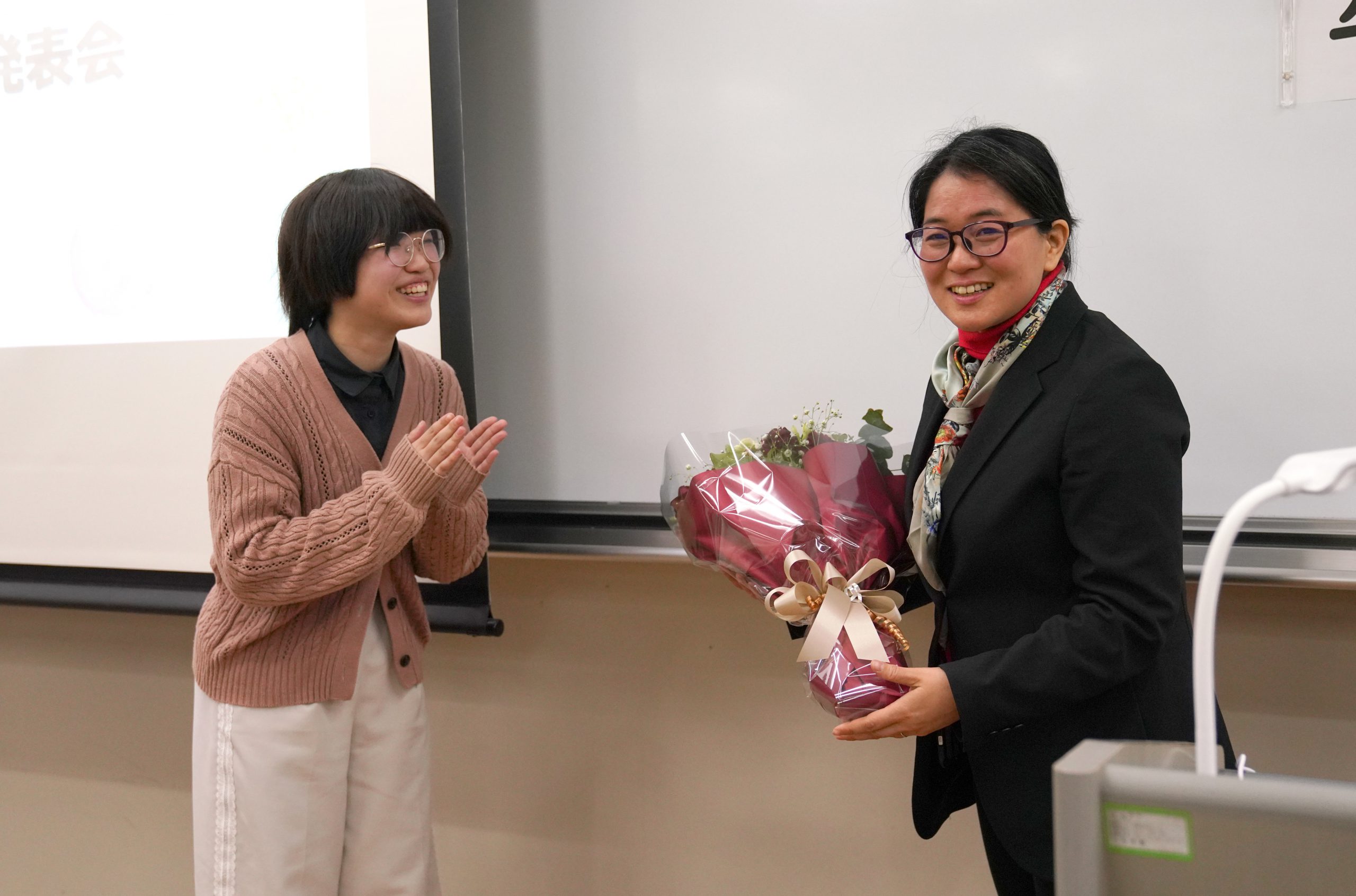 日本文化学科の山名順子先生は、今年度をもちまして本学をご退職されます。 日本近世文学・日本近代文学をご専門とされる山名先生は、長年にわたり熱心なご指導を続けてこられました。 卒業論文発表会の場で、ゼミの学生からこれまでの感謝を込めて、花束と記念品が贈呈されました。 山名先生、長い間本当にありがとうございました。先生のさらなるご健勝とご多幸を、心よりお祈り申し上げます。