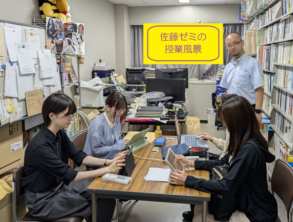 ゼミの学生は、「佐藤ゼミでは、研究室にお菓子が用意されていたり、ゼミ生がお菓子を持ち寄ったり、いろんな話をするところから始まる和やかな雰囲気のゼミです。雑談から研究へと話が移るので、緊張することなく興味のあるテーマを発表したり、先生や友だちにも落ち着いて気軽に質問をしたりしています。」とにこやかに教えてくれました。