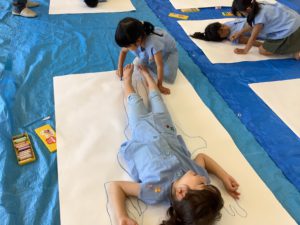 子どもたちは、まず、二人組を作って、一人の子どもが模造紙に寝て、もう一人が全身をクレヨンでかたどりしました。