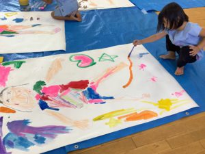 竹内先生からは「子どもたちは友達に型取ってもらう時からおおはしゃぎでした。夢中で絵の具を使って描いているうちに手や足を使ったり、絵の具を飛ばす方法を発見したりして子どもたちは大変すばらしい表現ができました。」との感想が届きました。