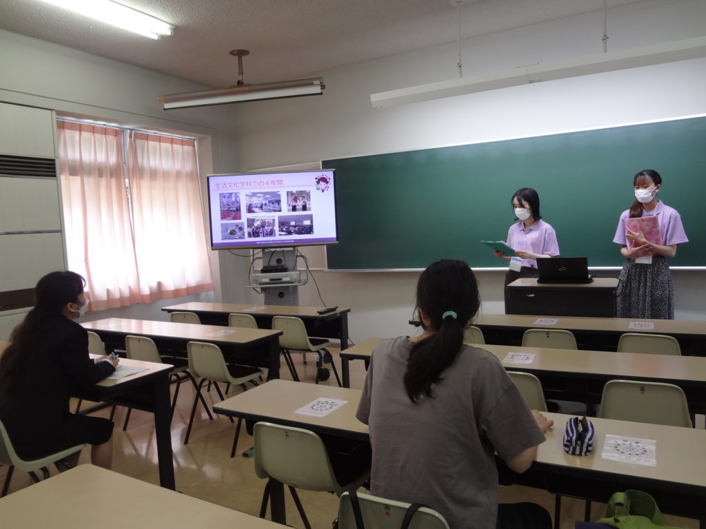 体験授業の前には,在学生による学科説明「教えて先輩!」を行いました。2名の先輩が学科の特徴や総合型入試の体験談など,緊張しながらもしっかりと説明しました。