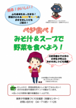 我孫子市では「市民が自ら健康づくりに取り組めるようなきっかけづくり」、「自ら健康づくりに取り組むことができる市民を増やすこと」を目標に毎年「健康フェア」を開催しています。本学科では我孫子市民の野菜摂取量の増加につながるよう、簡単な野菜レシピを考案し、提供しました。「ベジ食べ!みそ汁&スープで野菜を食べよう!」をテーマに学生がレシピを考案しました。今年はレシピを提供するだけでなく、ボランティアとして健康フェアに参加し、考案したレシピを市民の方にご紹介しました。