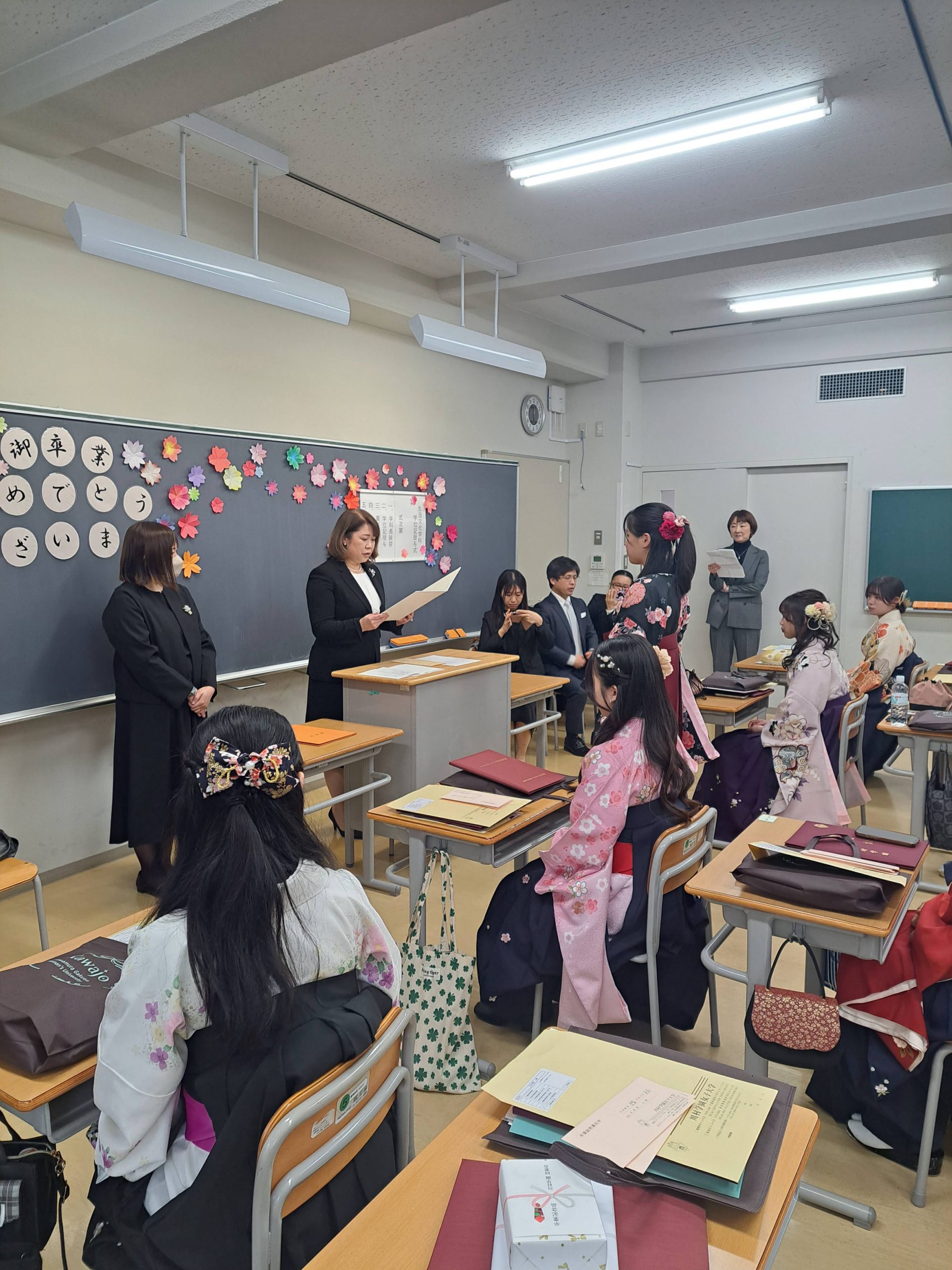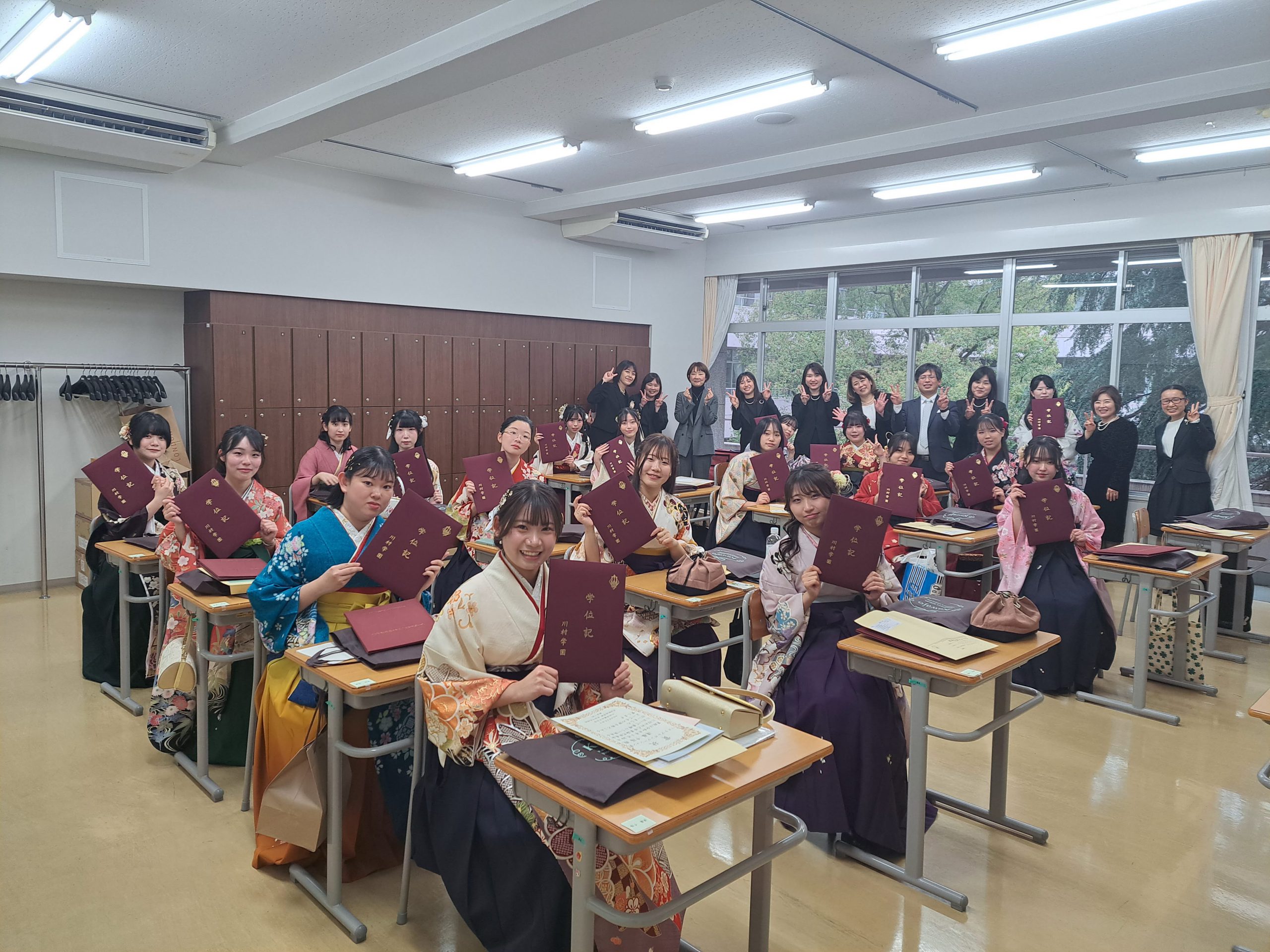 当日は、あいにくの空模様となりましたが、卒業生の表情は晴れやかで、温かな雰囲気が広がっていました。 式典後は学科ごとに分かれて、学科長より学位記の授与が行われました。