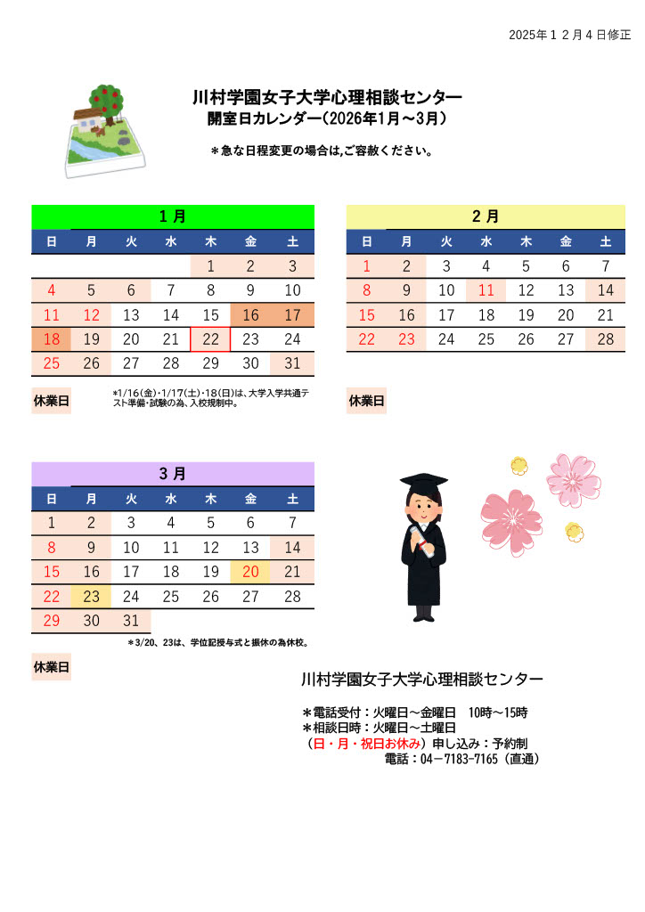 【ご案内】 チラシPDF ★心理相談カレンダー開室予定日(2026年1月~3月)